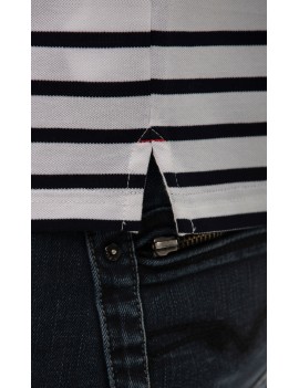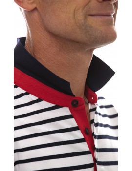 Des détails forts comme la patte de boutonnage contrastée ou le dessous de col rouge affirment le style de ce polo marinière résolument contemporain.